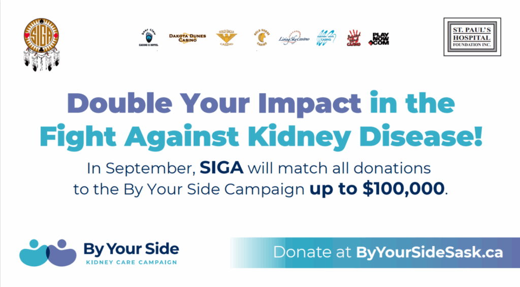 From September 1, 2025, the Saskatchewan Indian Gaming Authority (SIGA) will match all donations to the By Your Side Kidney Campaign up to $100,000 until September 30, 2025.